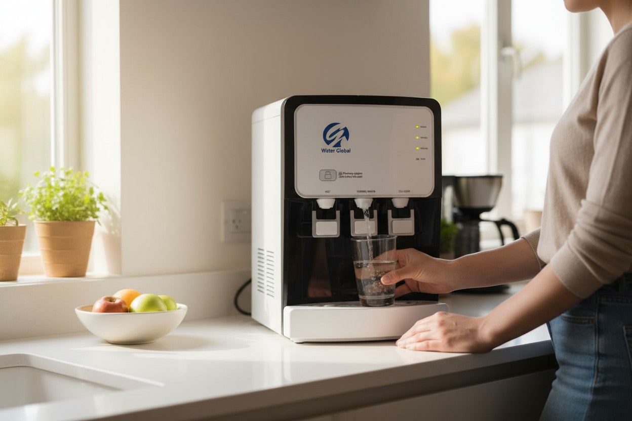 Water Global Şık tasarımı ve gelişmiş arıtma sistemiyle her yudumda taze ve güvenli su sunar. Ofis ve evler için ideal çözüm!